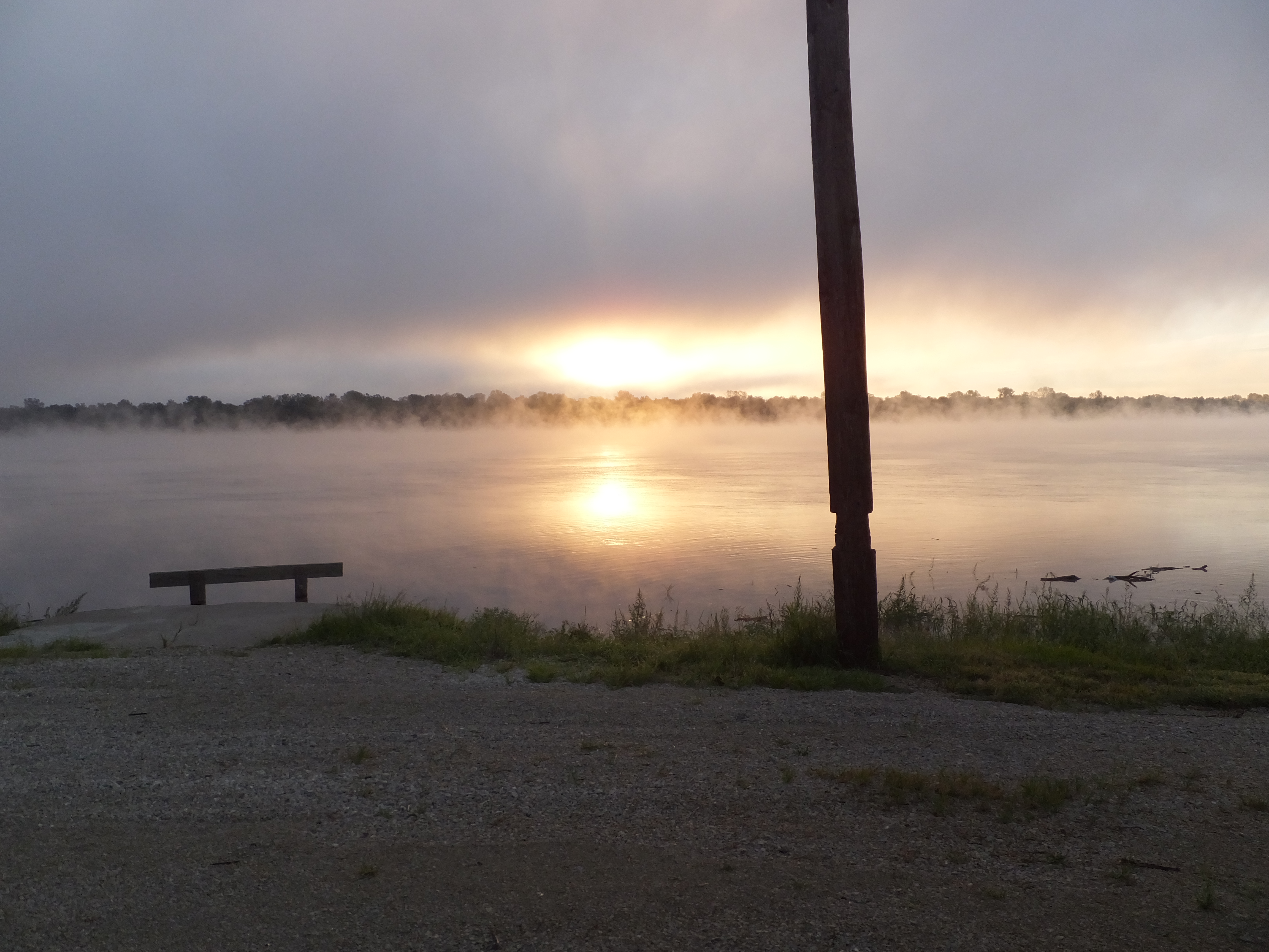 I awoke to a foggy Misissippi River. This makes two Sundays in a row where my start has been delayed by fog. It worked out well since, in addition to a spectacular site, Mike from the Boat Club arrived and shared his breakfast with me. I was finally off around 9am.